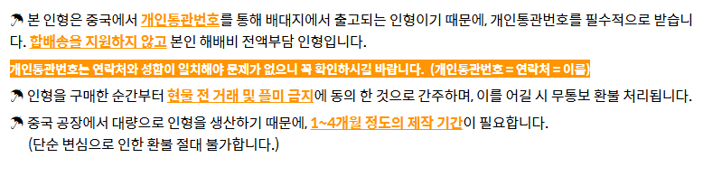 수량이 많지 않기 때문에 1인 1체 제한을 두었고 개인통관번호안내를 이때부터 드렸어요 그만큼 통관번호는 중요합니다