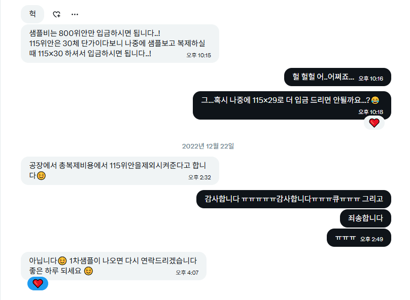 이렇게 문의를 드리면 샘플단가와 30체 단가를 알려주십니다 이 단계에서는 샘플값만 보내주시면 돼요