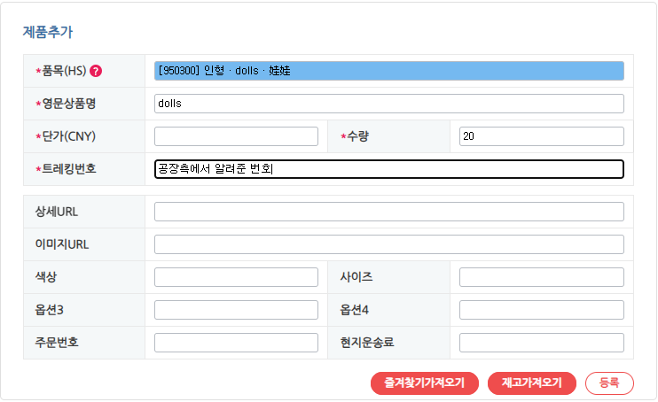 공장측에서 트레킹 번호를 보내주셨으면 배송대행 신청 페이지로 들어가셔서 제품 추가를 해줍니다