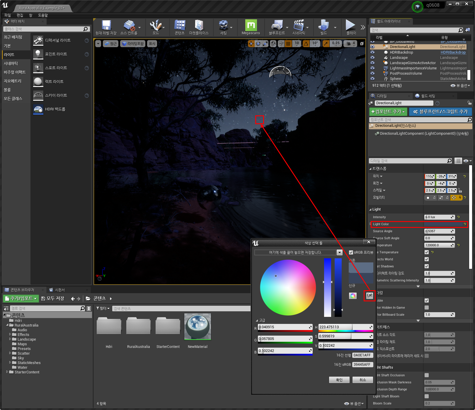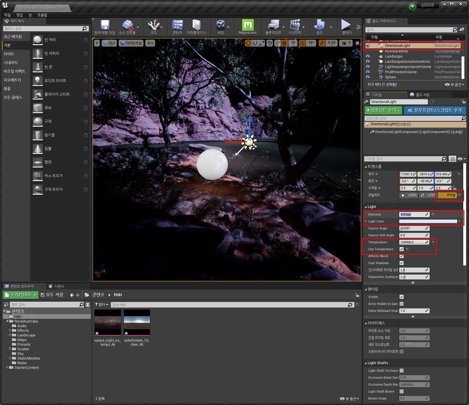 6) hdri 의 intensity를 낮춰주고 Directional Light의 색감도 하늘에 스포이드를 찍어서 맞춰주기
