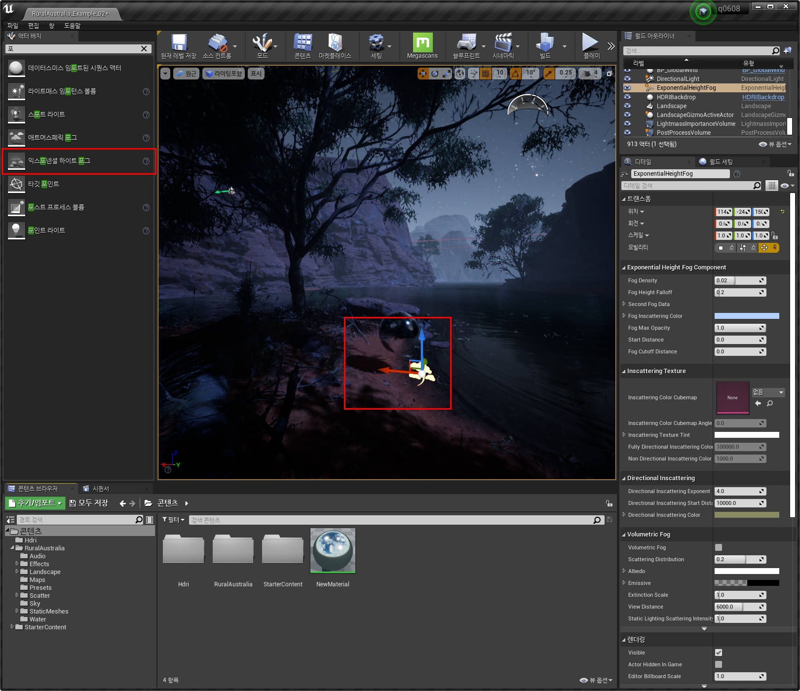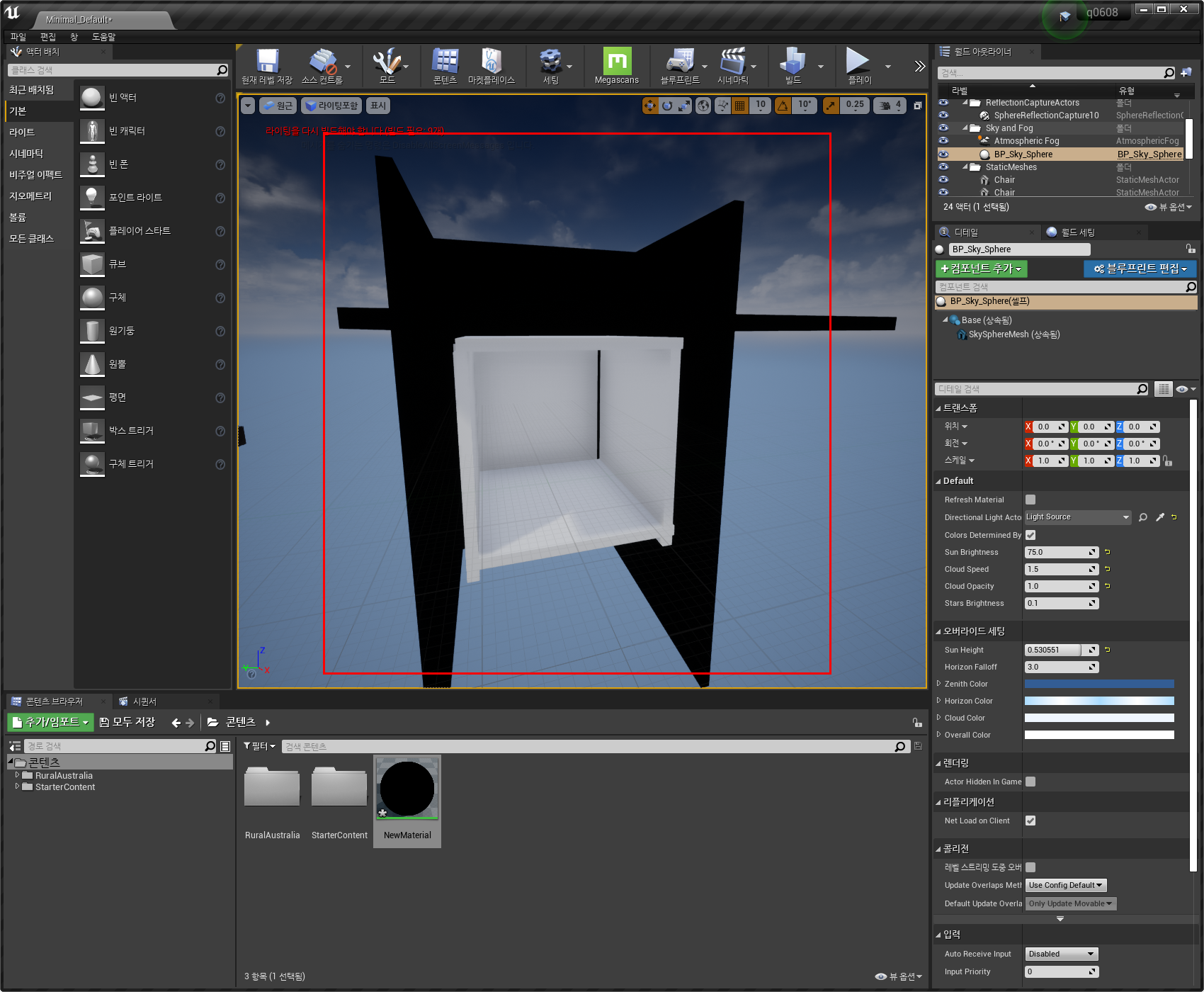 1) 안에 있는 라이트 (Sky Light / Directional Light / fog 지워주기)