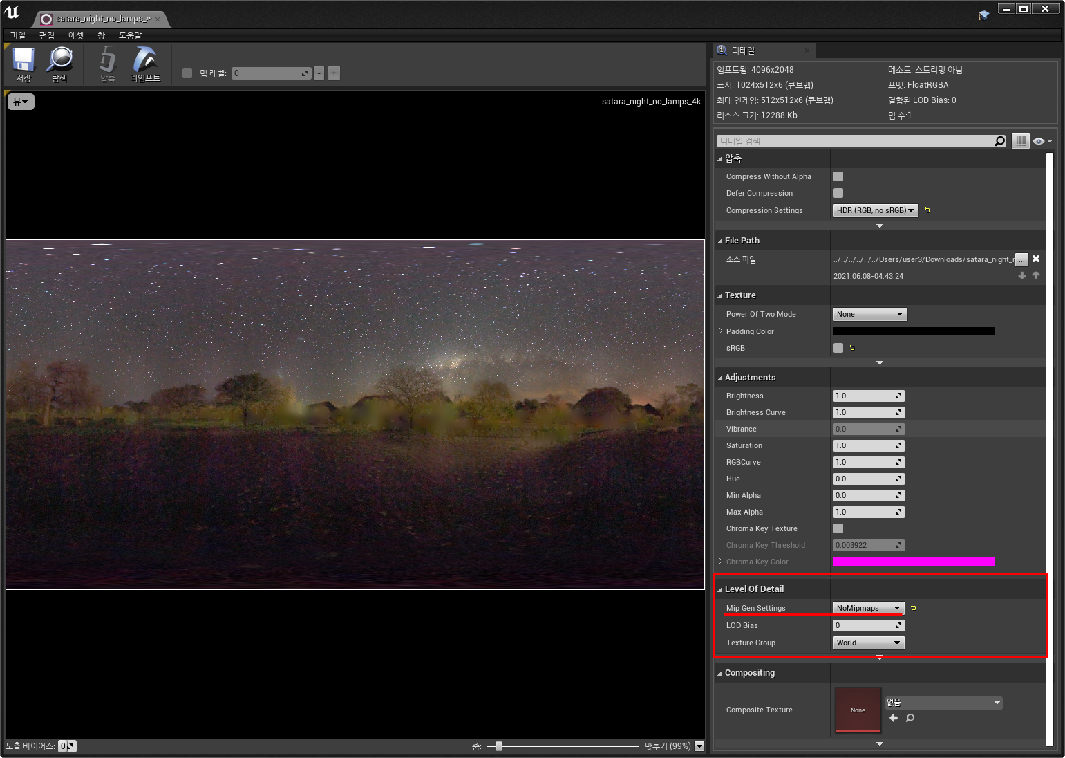 * 최종 랜더링을 할 때는 LOD를 0으로 두고 하는 것이 좋다