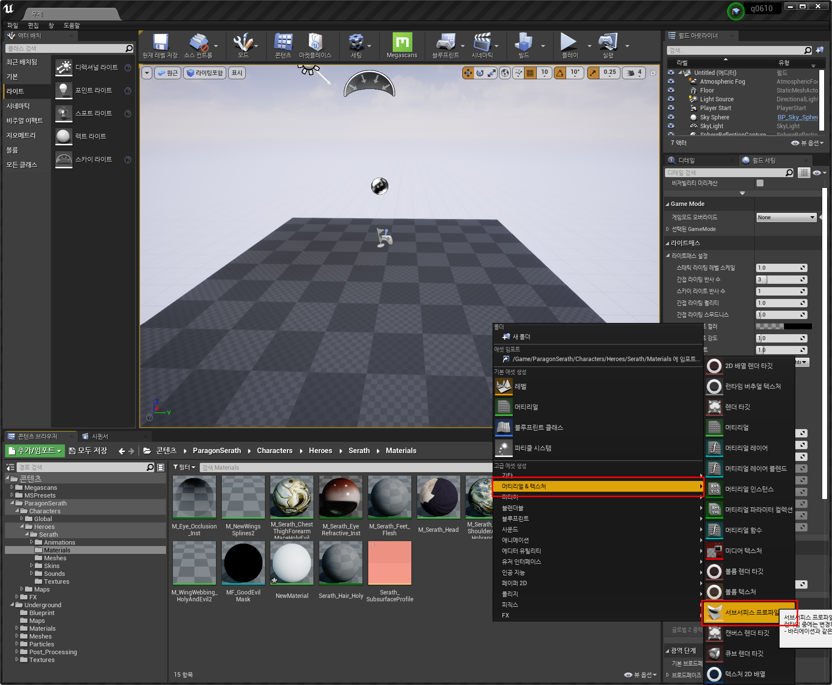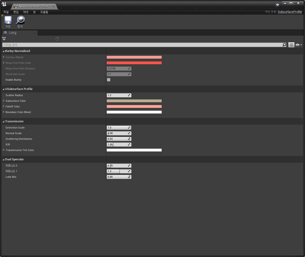 1) SSS를 적용하기 위해서는 메터리얼의 Shading Model을 Subsurface로 바꾸고 Subsurface Profile에 서브서페이스 프로파일을 만들어 넣어주면 됨