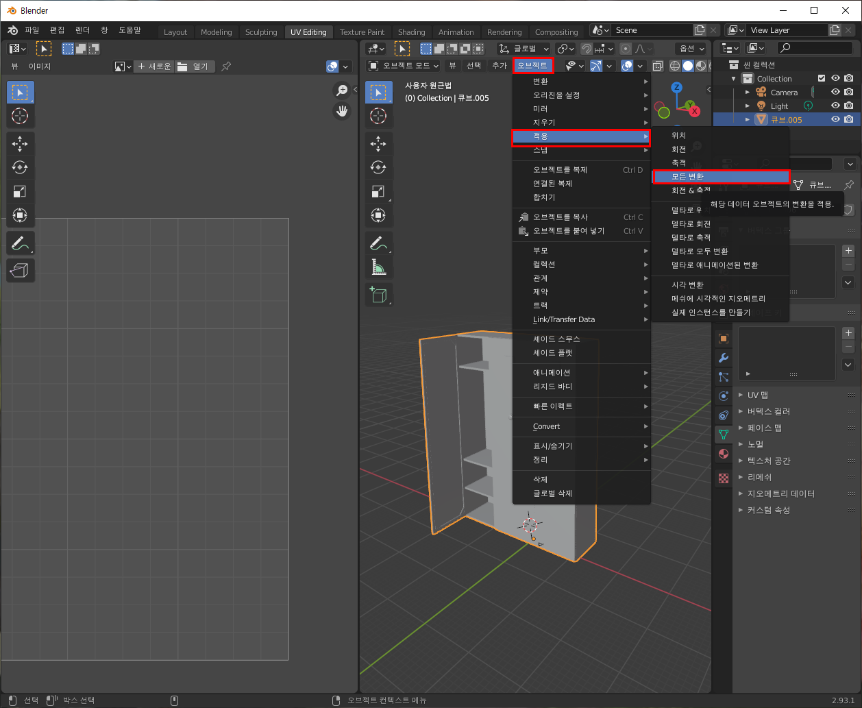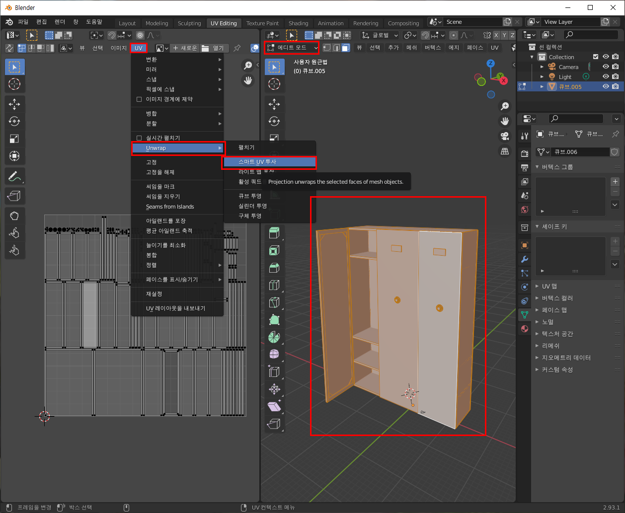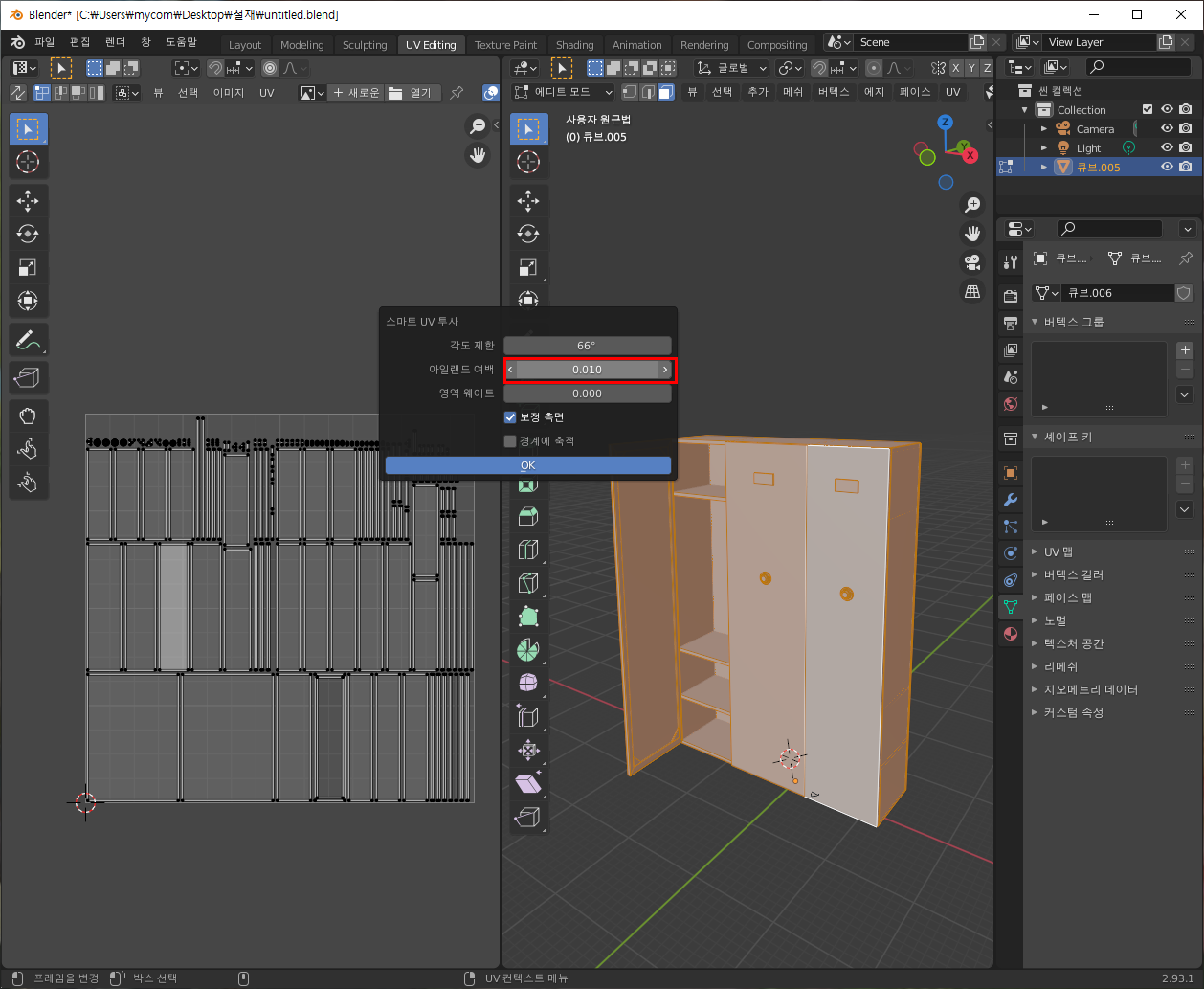 2) UV 자동으로 피기(Ctrl+A 눌러서 모든 면이 선택하고 해야함)