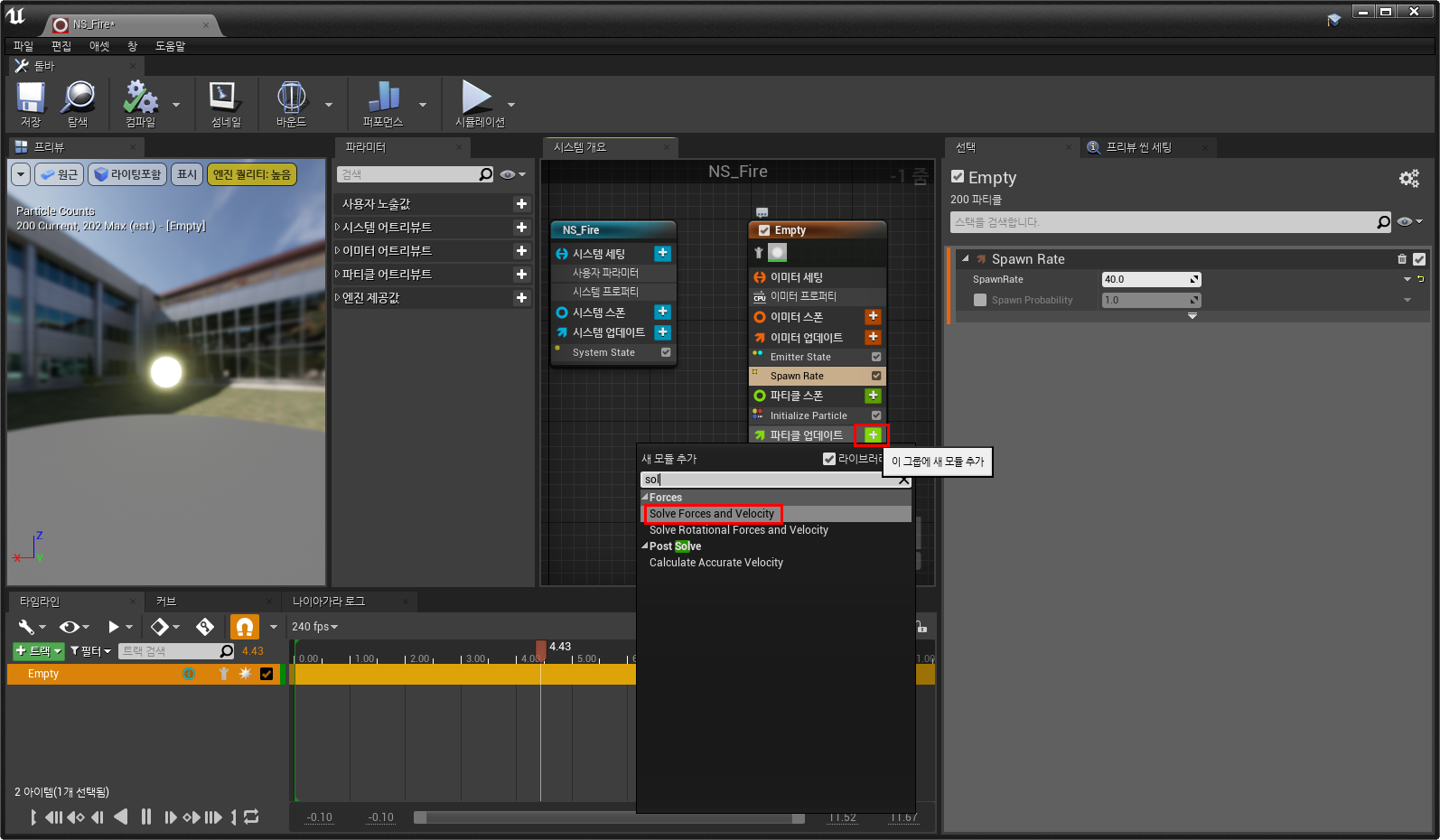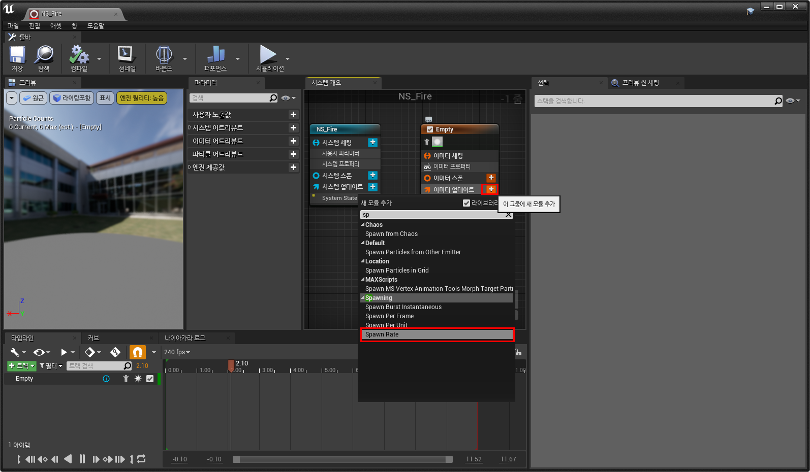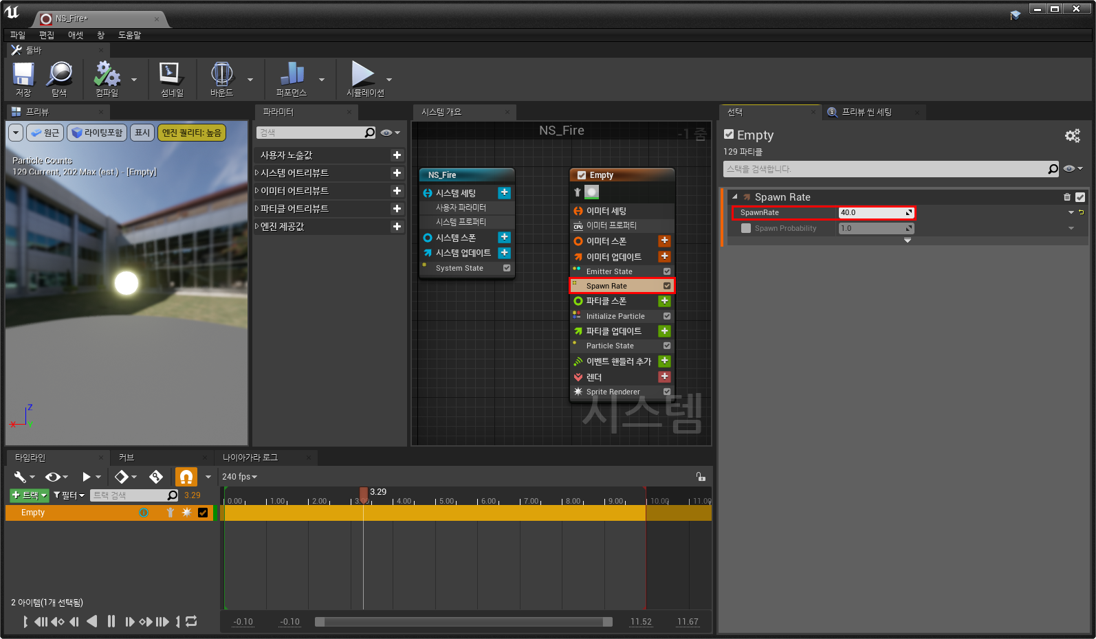 3) 생성된 나이아가라 클릭 - 이미터 업데이트 - Spawn Rate 추가