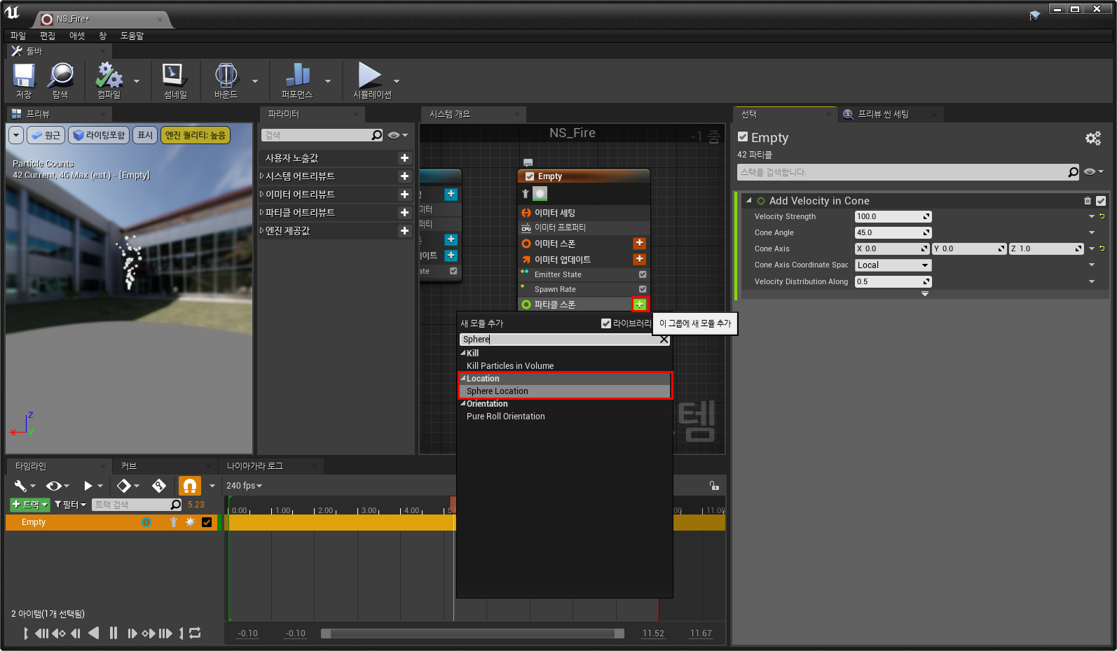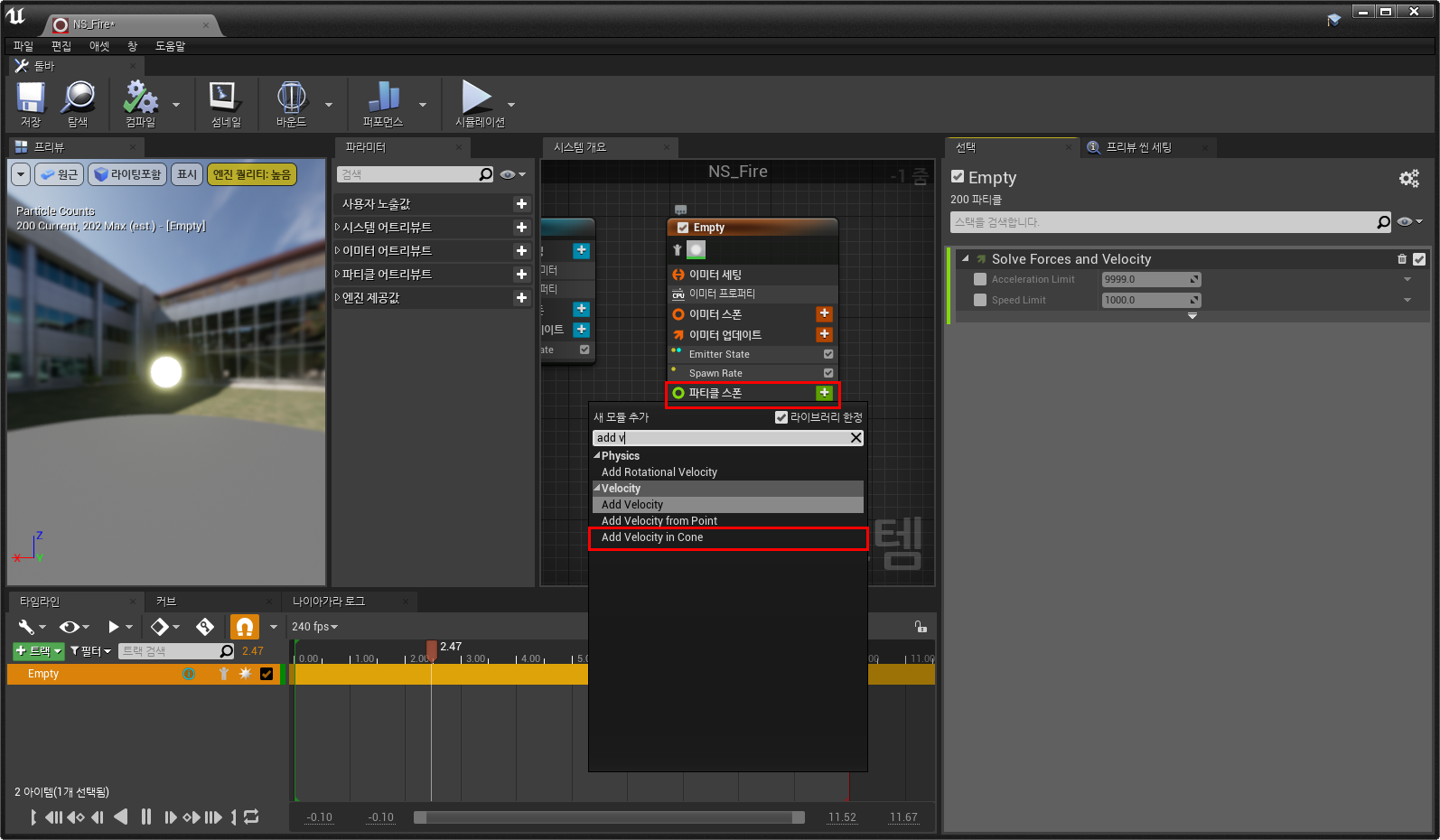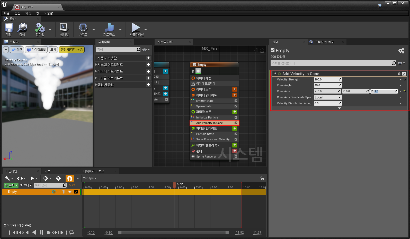 6) 파티클 스폰 - Add Velocity in Cone 추가