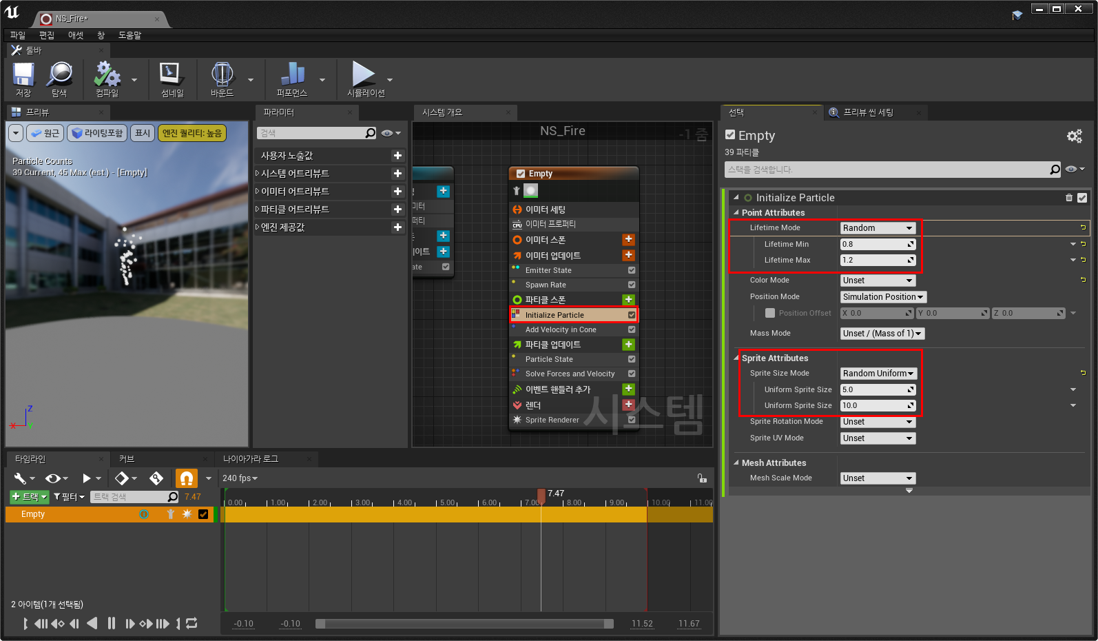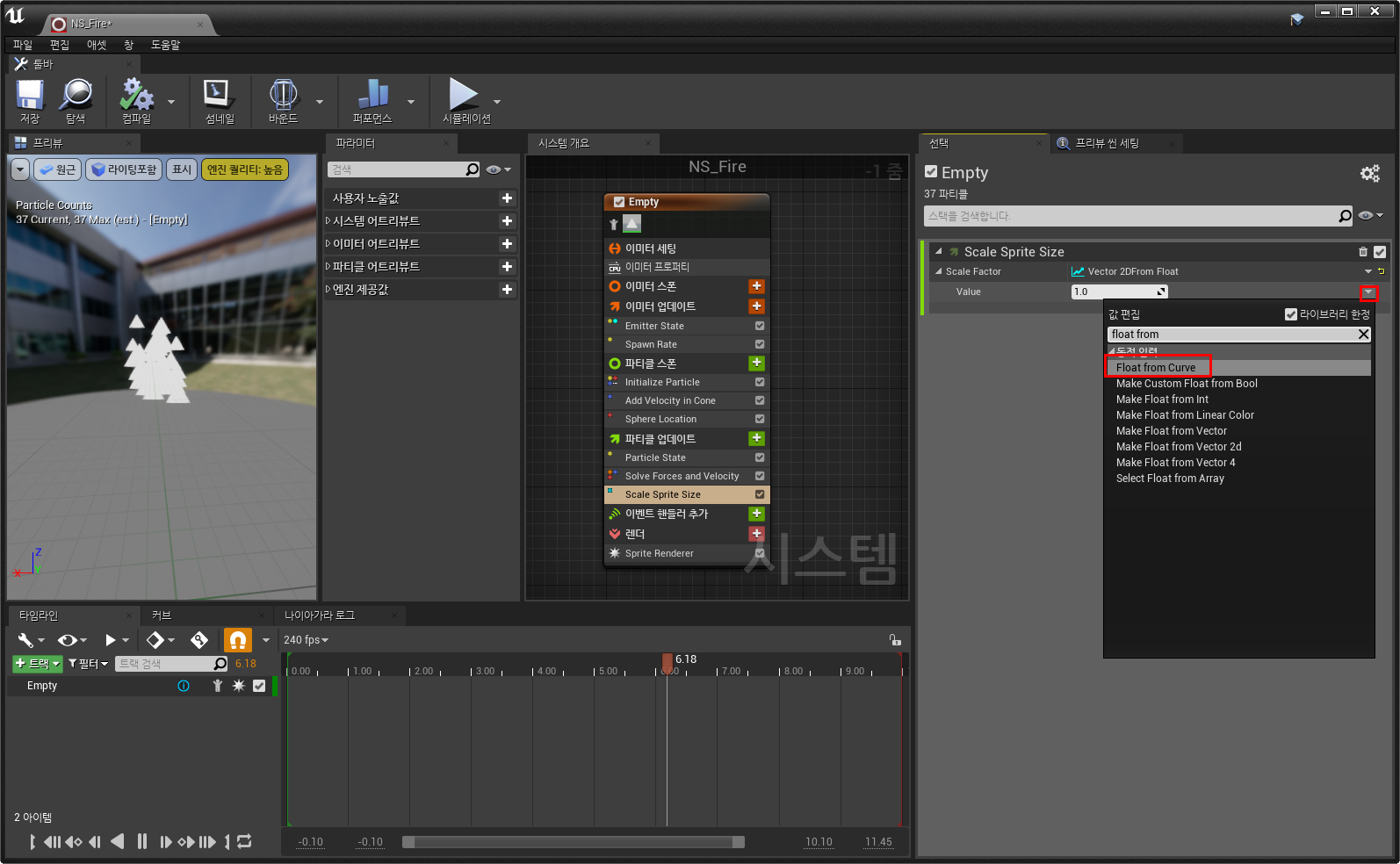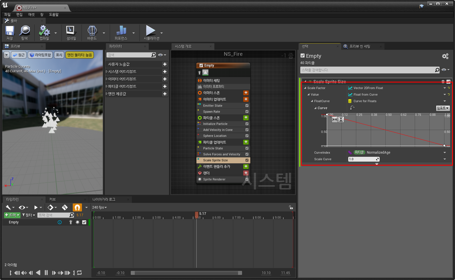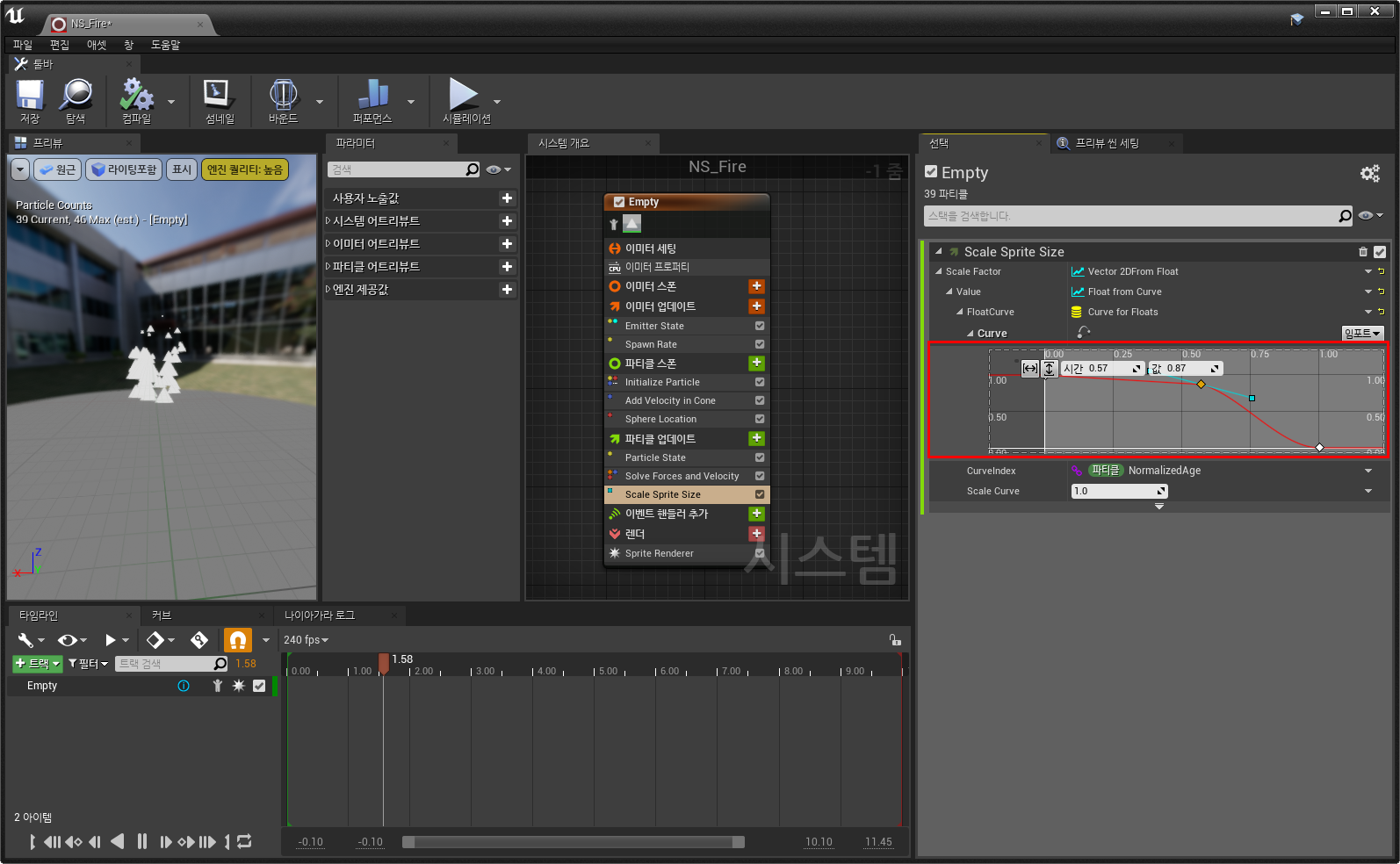 9) 커브의 수치를 조작하여 파티클이 사라질 때는 크기가 작아지게 만들기