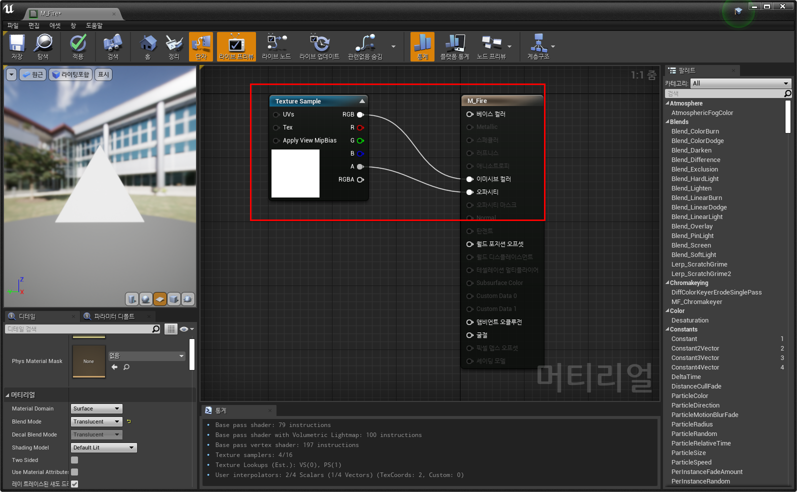 3) 배경이 투명화 된 삼각형 텍스처의 색을 이미시브 컬러에 연결하고