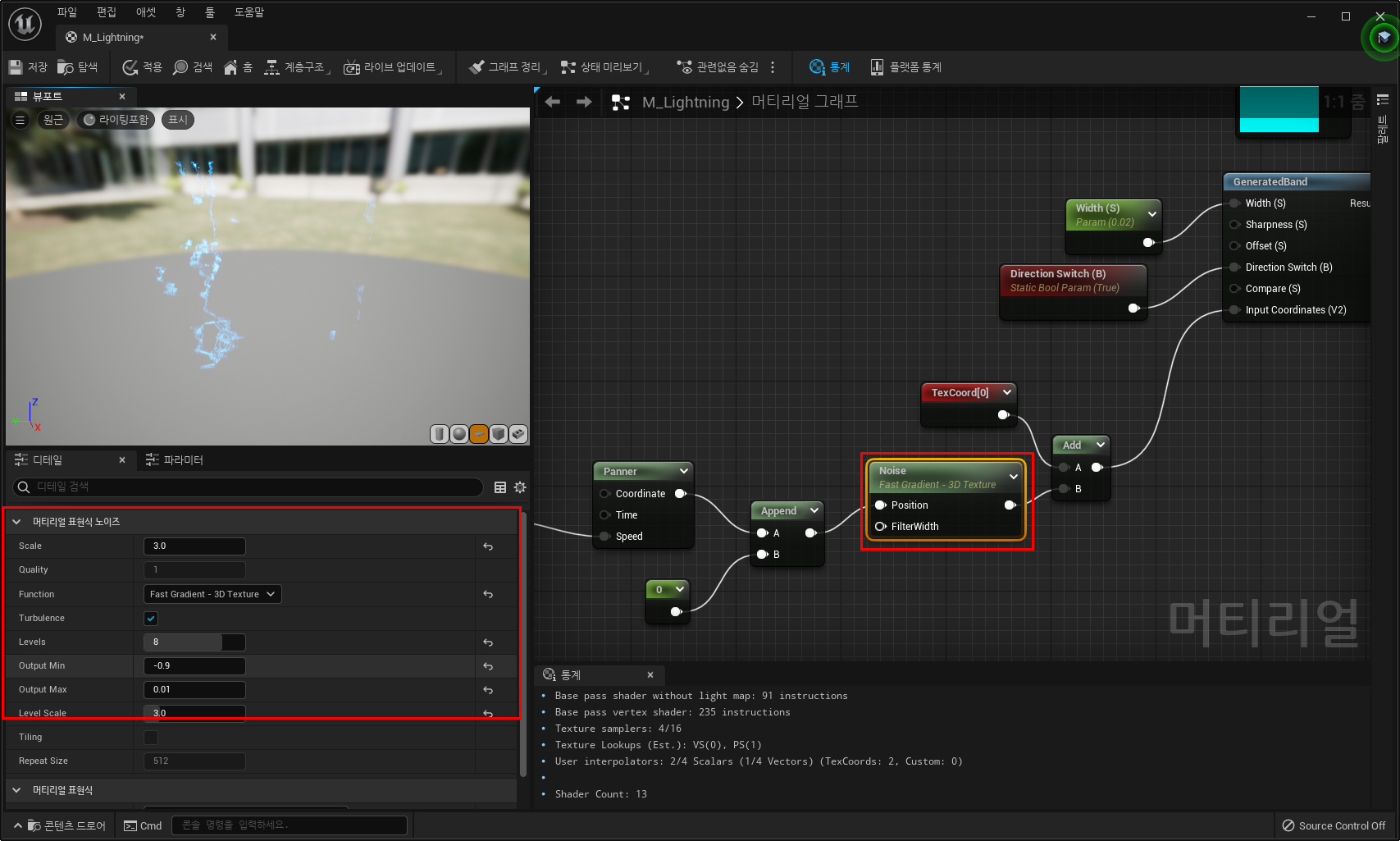 7) 선이 번개처럼 보이게 하기 위해 Noise 노드와 Panner 노드추가