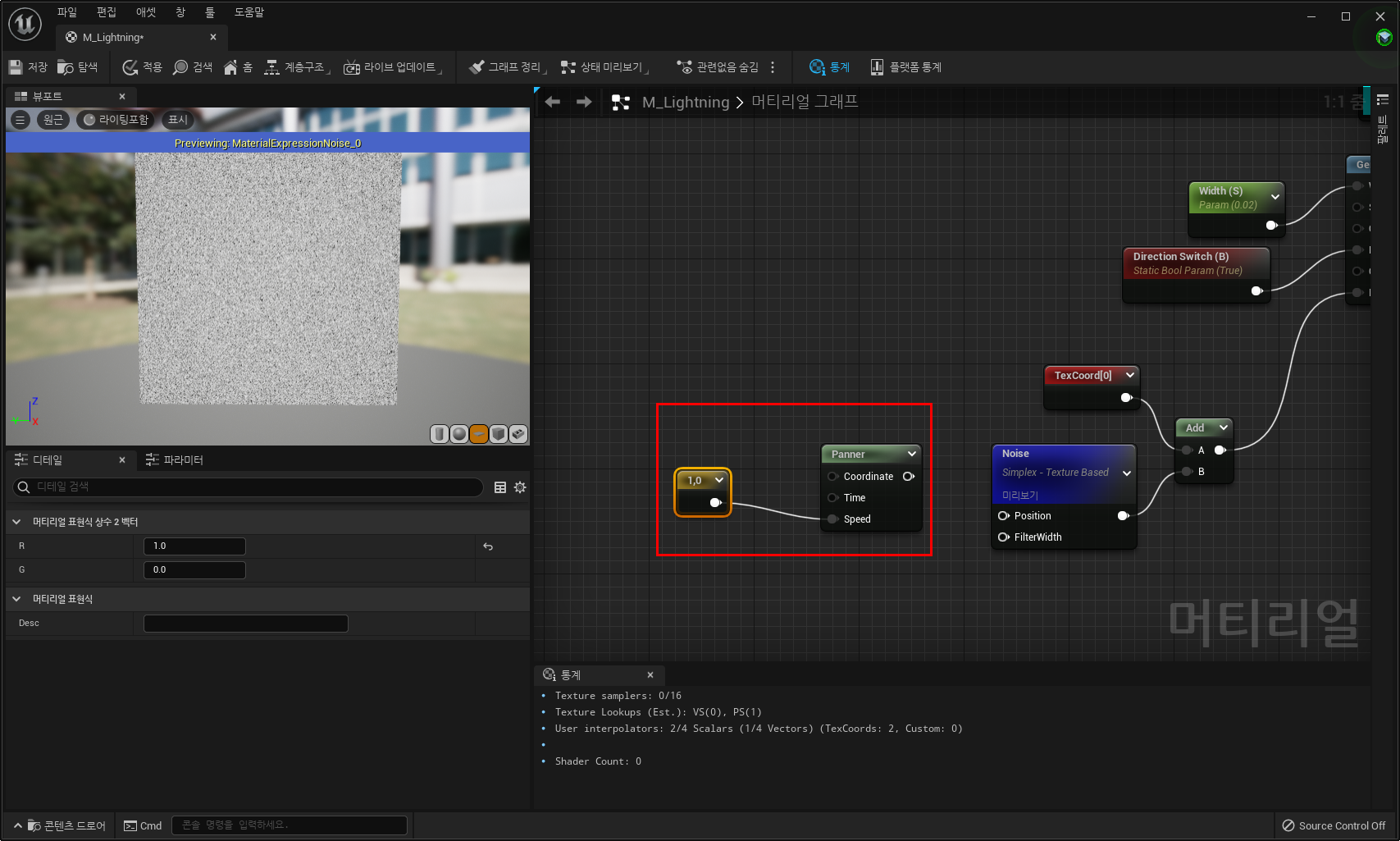10) Panner노드의 Speed에 벡터2 노드를 연결한 뒤 R의 값에 1 입력하기