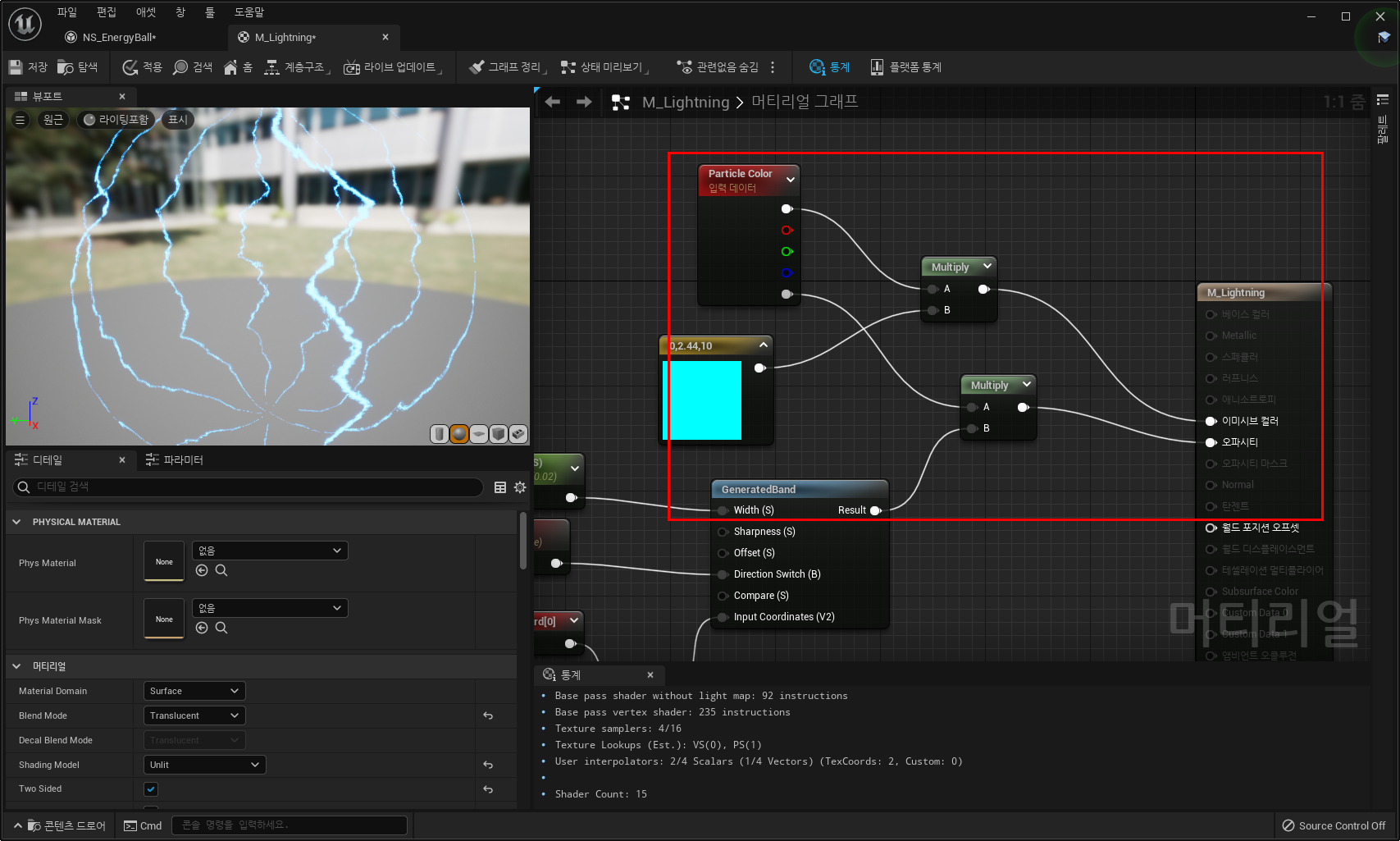 6) 이펙트의 색을 변경하기 위해 번개 머티리얼에 Particle Color노드를 추가하고 이미시브에 연결